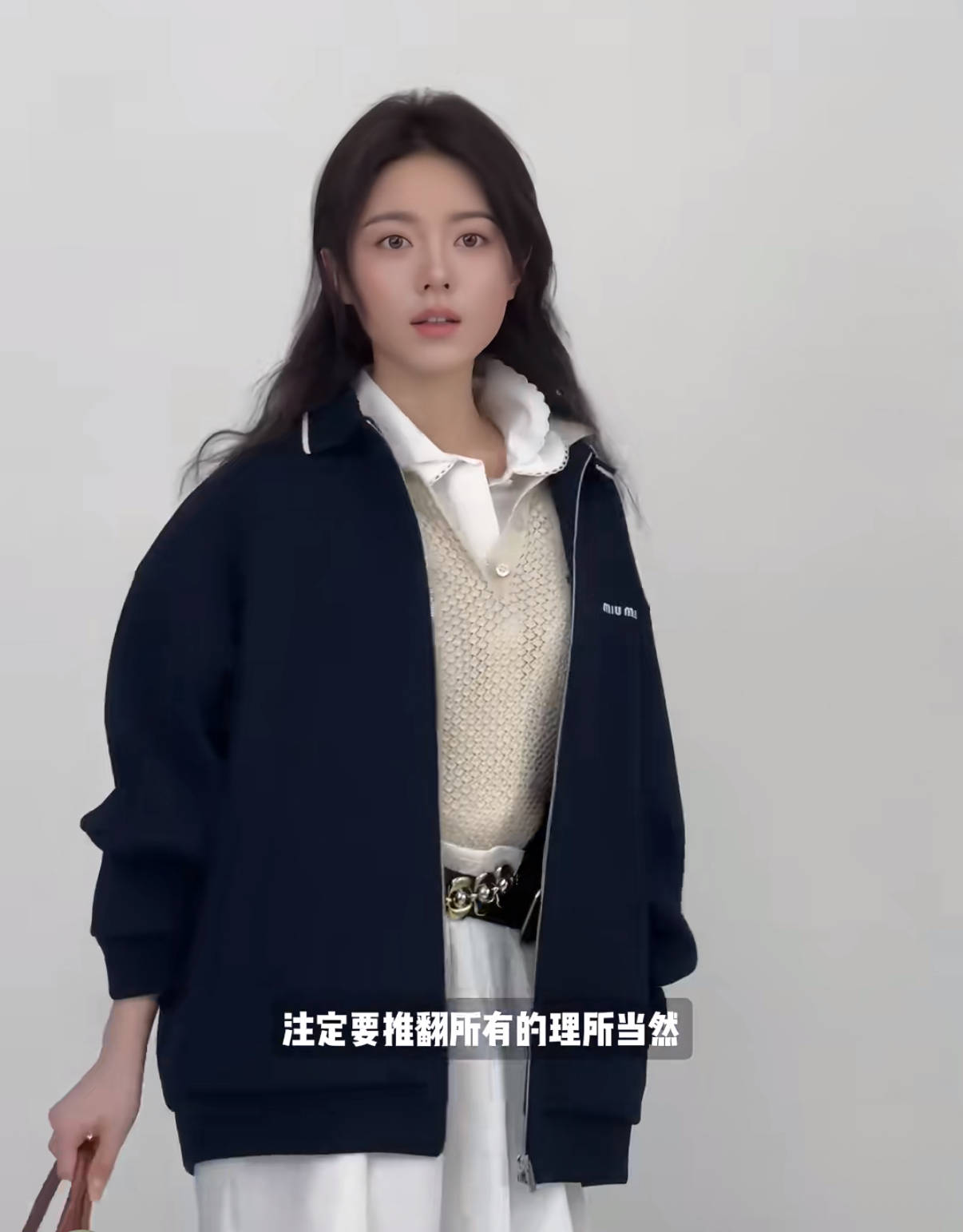内搭是浅蓝色衬衫与酒红色内搭,层次感十足。下身搭配藏青色休闲西裤,金属挂链的点缀多了街头感。既保留了 Miu Miu 的少女感,又增添了酷飒的中性风,适配日常通勤、休闲出行等多种场景。