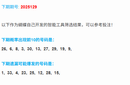 本期分析:本期的冷热分布,本期的遗漏大于9的号码有7个,上期的冷码开出了1个号码,温码开出了3个号码,上期热码也开出了1个号码,本期来看,冷码依旧不多,考虑1到2个冷码即可,热码也不会太多,考虑1到2个号码,温码依旧是近期的重点,本期考虑2到3个号码。(热码:蝴蝶算法中概率前10的号码,只有10个;冷码:遗漏大于等于9的号码;温码:排除前2类之外的剩下的号码,都是温码;)
