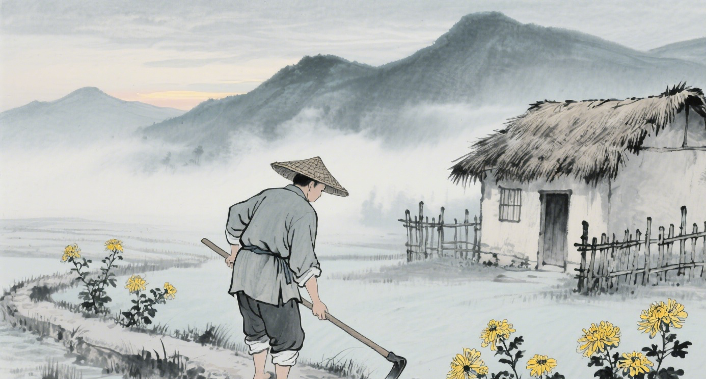 在田里劳作时,他写下了《归园田居》五首,其中 “种豆南山下,草盛豆苗稀” 成了最广为人知的句子。有人笑他种地不专业,他却在诗里回应:“晨兴理荒秽,带月荷锄归”,重要的不是收成,而是劳作本身带来的踏实。院子里种的菊花,更是成了他的精神象征 ——“采菊东篱下,悠然见南山”,这两句诗里的闲适,是他挣脱官场束缚后才有的心境。
