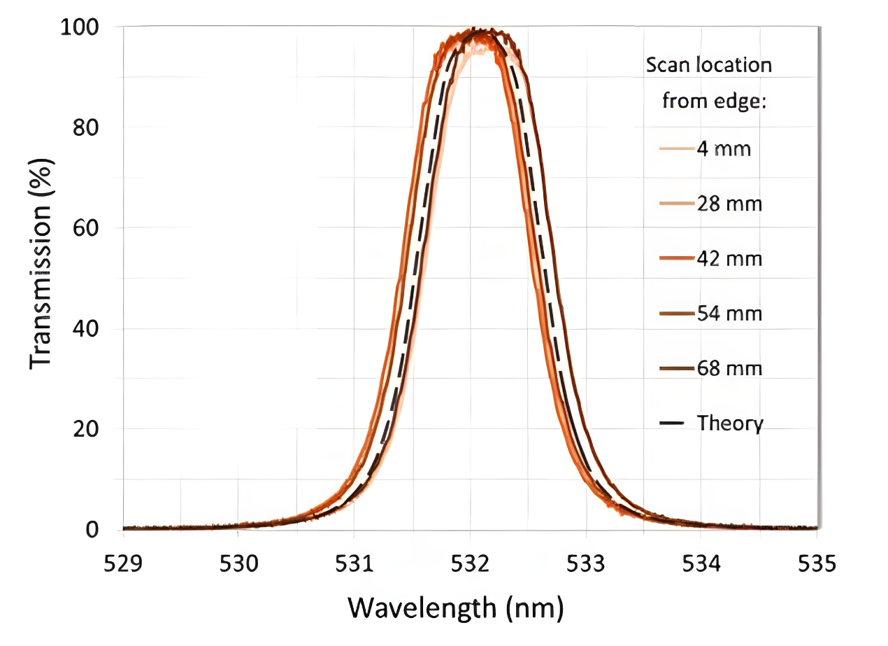 Alluxa的解决方案: 通过严格控制镀膜均匀性,确保整个通光孔径内的中心波长变化 < 0.035%。这意味着无论信号打在滤光片的哪个位置,它都能被准确捕获。