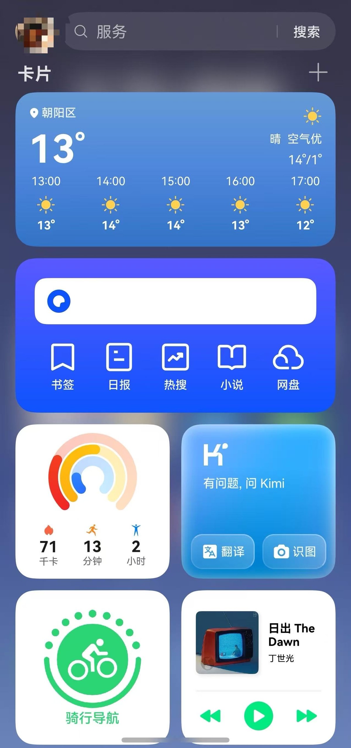 还有最下面的服务卡片区也很实用,点击右上角“+”号就能添加你需要的卡片,还有不少样式可选。夸克和Kimi的服务卡片特别贴心,它们可以通过深度思考帮我制定徒步、登山等运动计划,省得我亲自查地图、定路线。运动健康的服务卡片也能让我更加清晰地看到当天的运动状态。骑行导航和QQ音乐的服务卡片则是我户外骑行的好搭子,一边听歌一边享受骑行的快乐,简直不要太惬意。