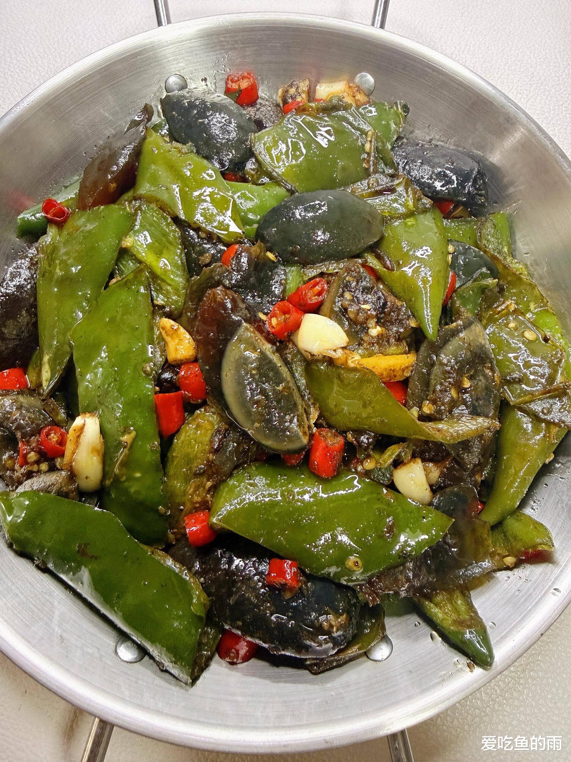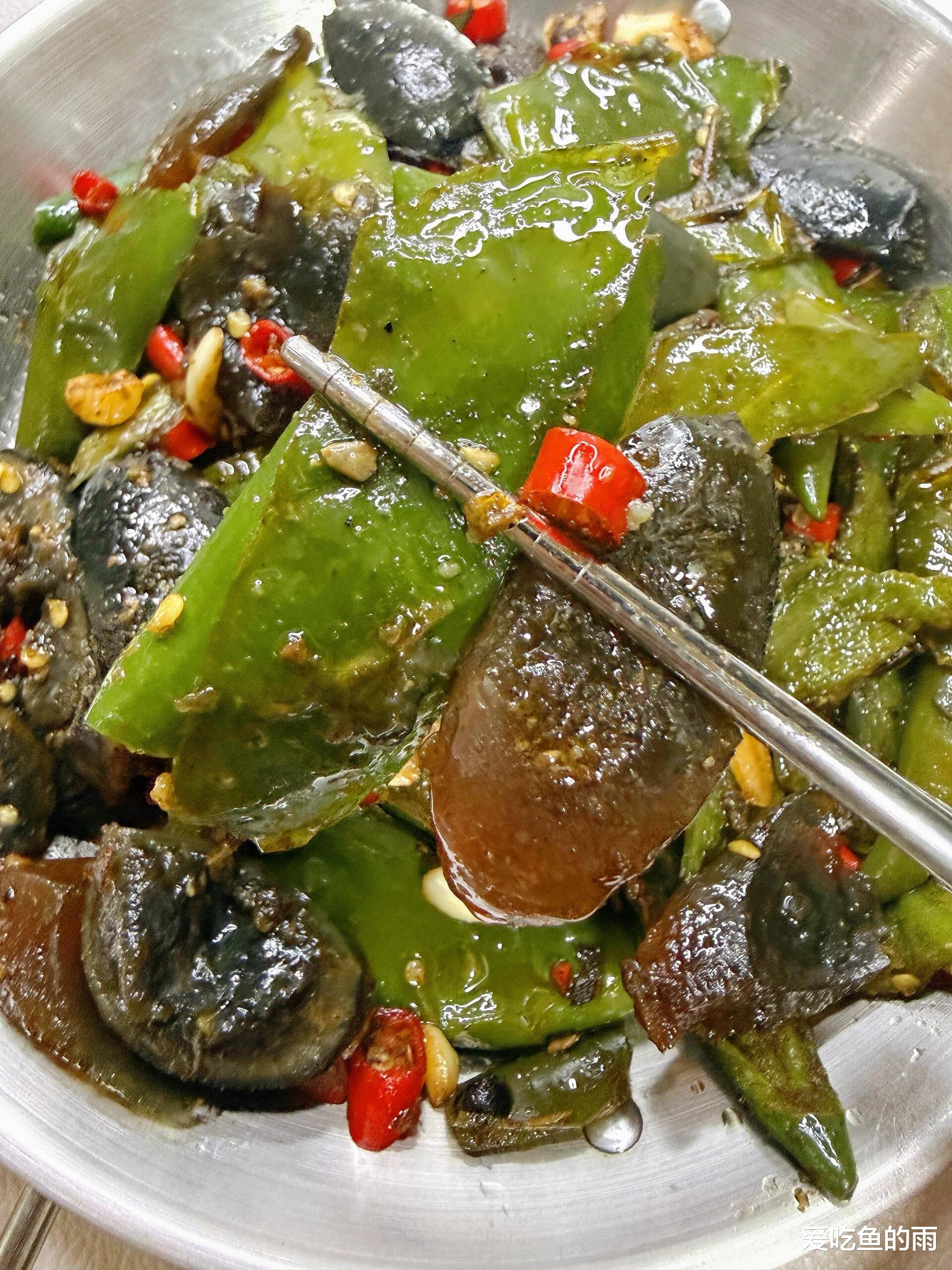 最后,把刚才煸好的辣椒倒回锅里,和皮蛋来个“亲密接触”。这时候沿着锅边淋入一勺生抽,激发出酱香味,再加一点点盐和鸡精调味。记住,皮蛋本身就有咸味,盐一定要少放。大火快速翻炒均匀,让辣椒的焦香和皮蛋的醇厚完美融合,最后撒上一把蒜苗或者葱花点缀。出锅的那一刻,皮蛋裹着油光,辣椒翠绿诱人,夹一块放进嘴里,皮蛋的Q弹、蛋黄的绵软、辣椒的鲜辣在舌尖炸开,那种奇妙的复合口感,绝对会让你对这道菜刮目相看。
