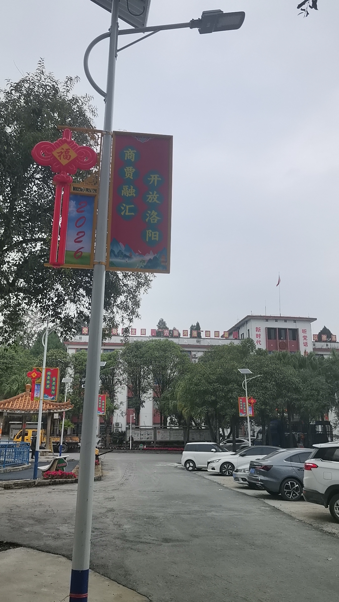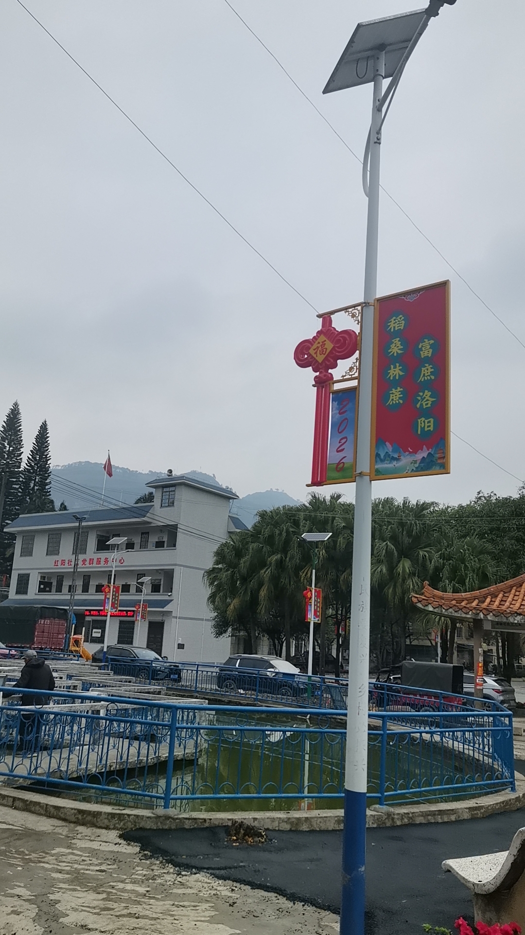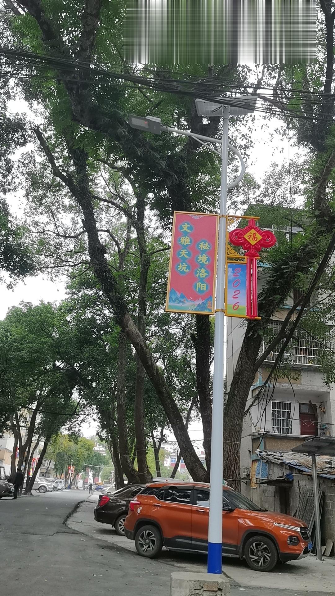 放眼望去,家乡的建设也日新月异。各种工程项目正紧锣密鼓地收尾,为新年的到来增添一份喜庆。道路铺设焕然一新,主干道和人行道都涂上了鲜亮的红色油漆,红彤彤的色彩映衬出浓浓的节日氛围。广场中央的舞台已整修一新,几队演员在操练节目,期待着春节晚会的精彩演出。而最引人注目的,是那几根新竖起的太阳能灯杆,每一根都挂满了迎春的宣传画和祝福语,红底金字,喜气洋洋。