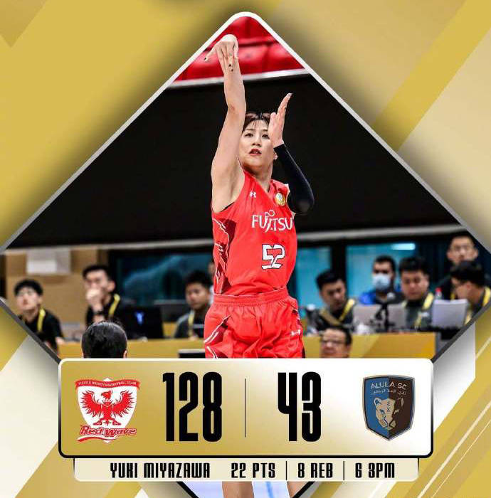 另外一场比赛,日本富士通红浪女篮128-43狂胜沙特阿尔乌拉女篮。富士通红浪队宫泽夕贵22分,林真帆22分。