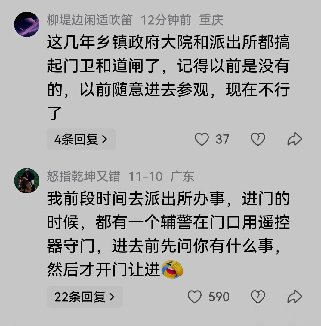 有一位网友评论区留言称,他前段时间去派出所办事,进门的时候,都有一个辅警在门口用遥控器守门,进去前先问你有什么事?说清楚了然后才开门放进去。