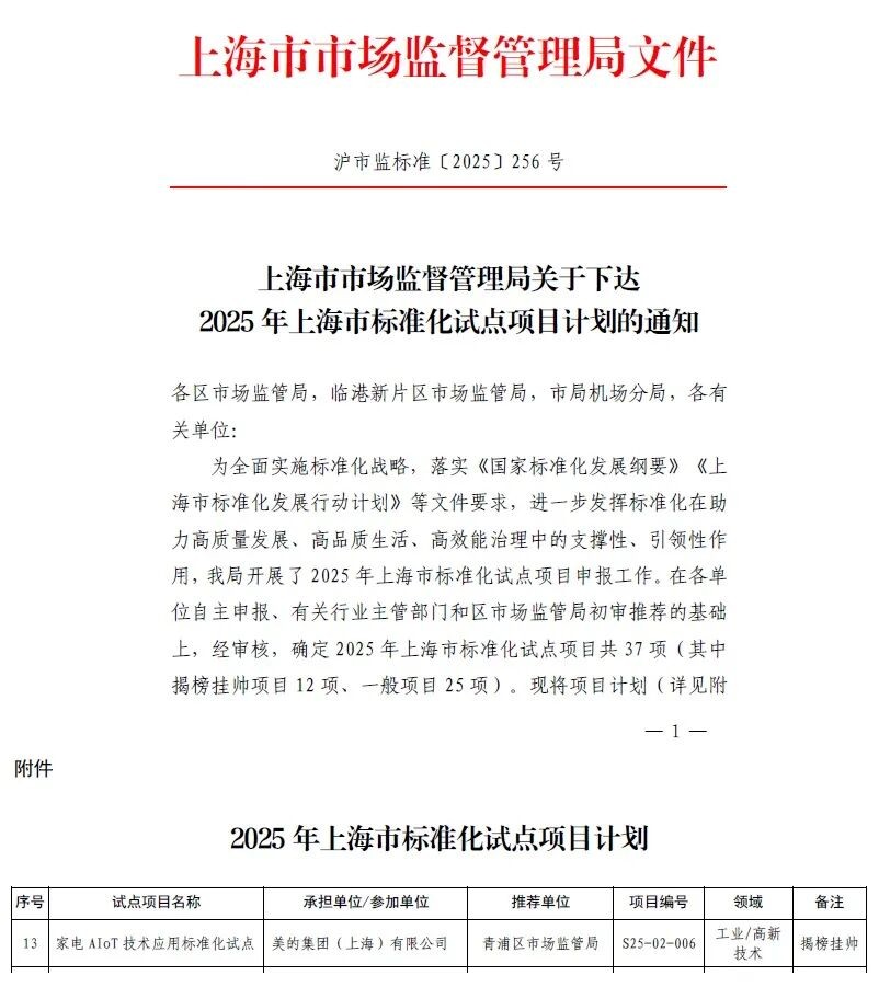 在此之前,今年8月,美的上海公司刚刚获批2025年上海市标准化试点项目——“家电AIoT技术应用标准化试点”,两项成果体现着集团智能家居标准化工作步入了新的台阶。