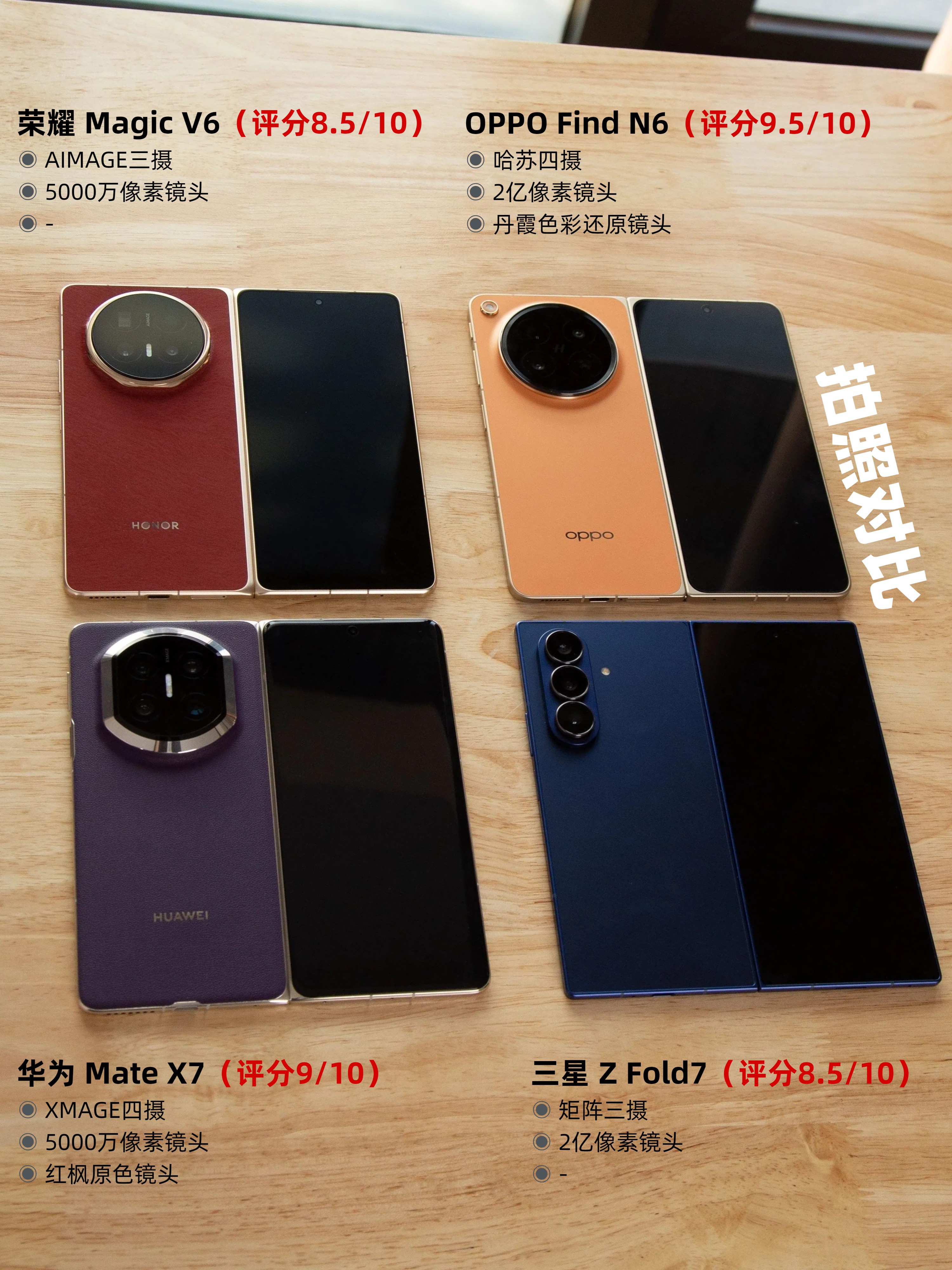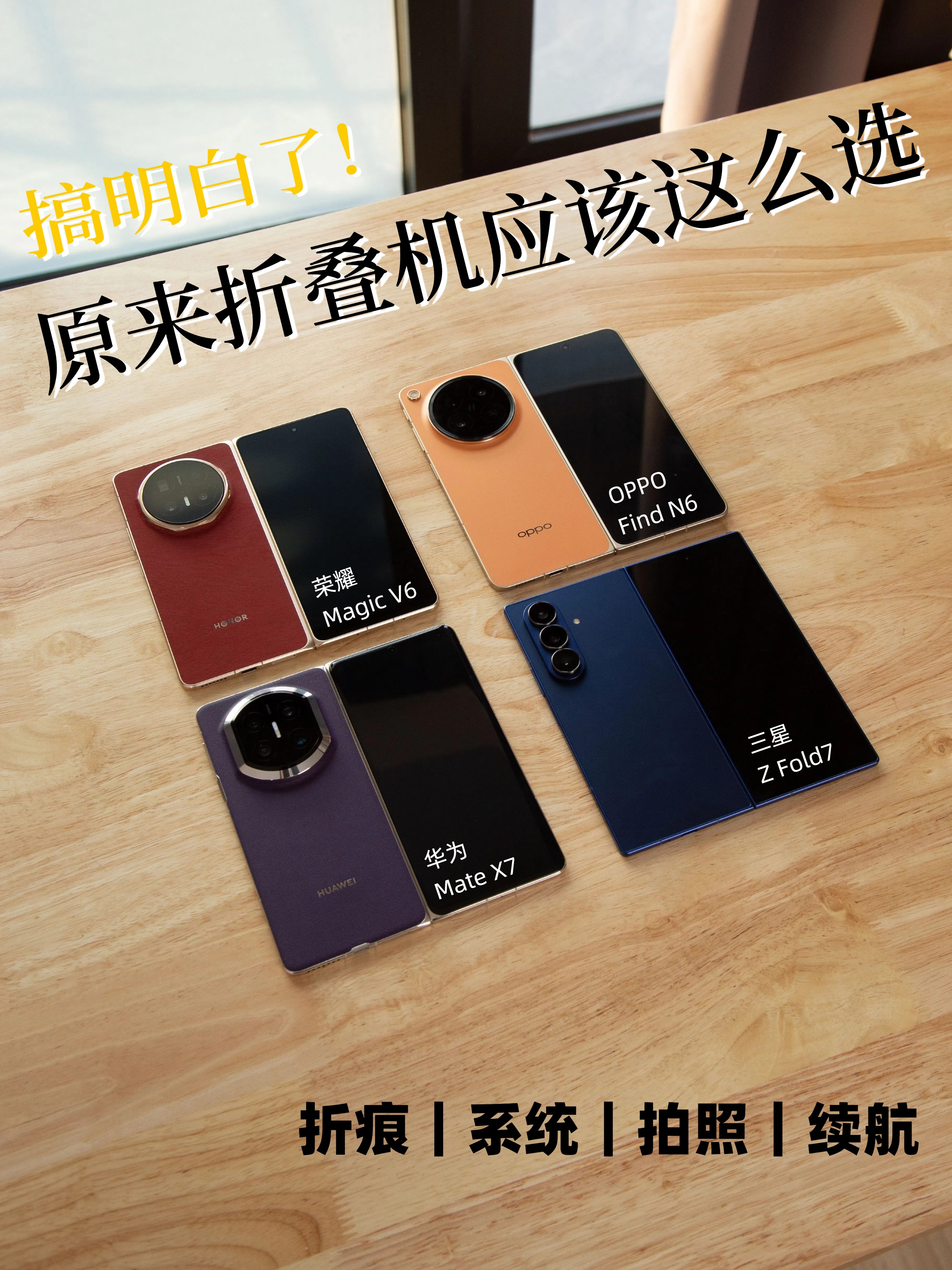 👉总结:华为 Mate X7依旧是“面子之选”,送领导或者长辈都不错;OPPO Find N6适合追求新技术和高质感的朋友,无感折痕很香,另外系统影像续航也都很强;荣耀 Magic V6的话可以看作是华为平替;三星 Z Fold7的话推荐给有出国需求的朋友~下单前也可以先到店里体验下再做决定🙋♀️