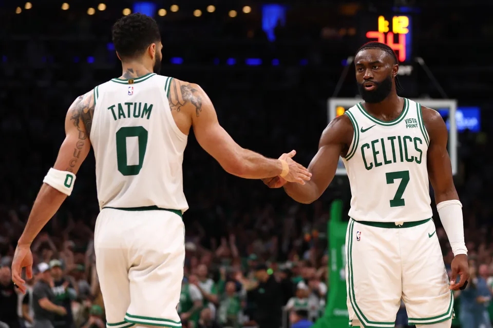 Jaylen Brown与Jayson Tatum。 (Photo by Maddie Meyer/Getty Images) (Maddie Meyer via Getty Images)