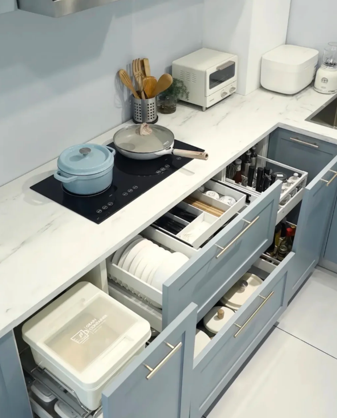 厨房里的小工具、餐具也适合这种方法,把快递盒剪成合适的大小,做成分隔板,台面上零碎东西不再乱堆。