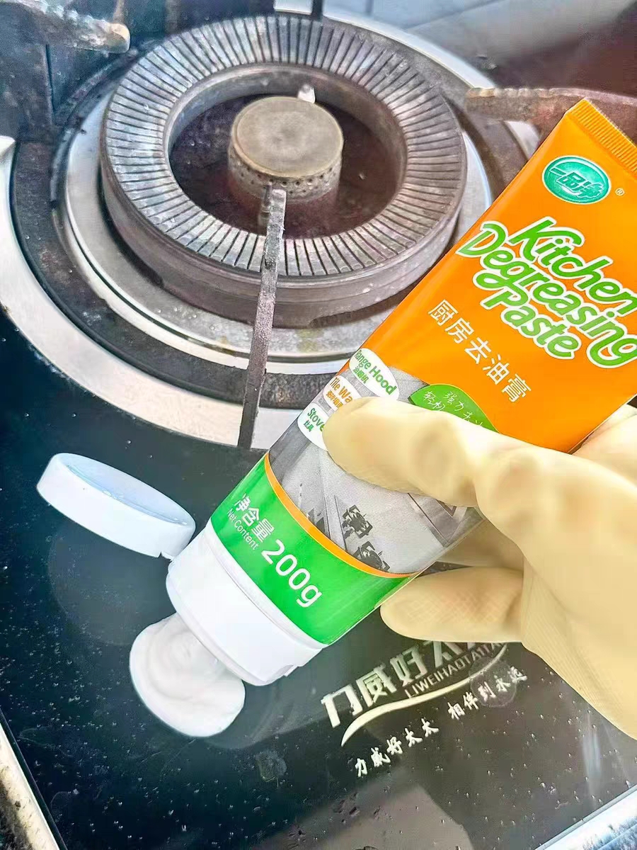 我的做法是:用牙刷蘸膏体,针对死角厚敷几分钟,静置后用湿布一擦,顽固油渍就能轻松去除。 尤其是油烟机滤网、灶台边角和墙面,用膏体定点“爆破”,油污被牢牢吸附,整个过程没有二次清洁的烦恼。