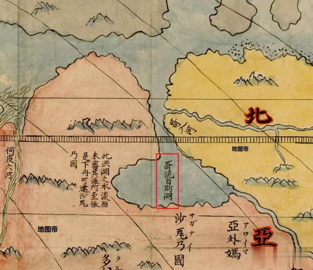 日本人临摹的《坤舆万国全图》上,将“白”字抄成“自”字,改成了“哥泥自斯湖”。
