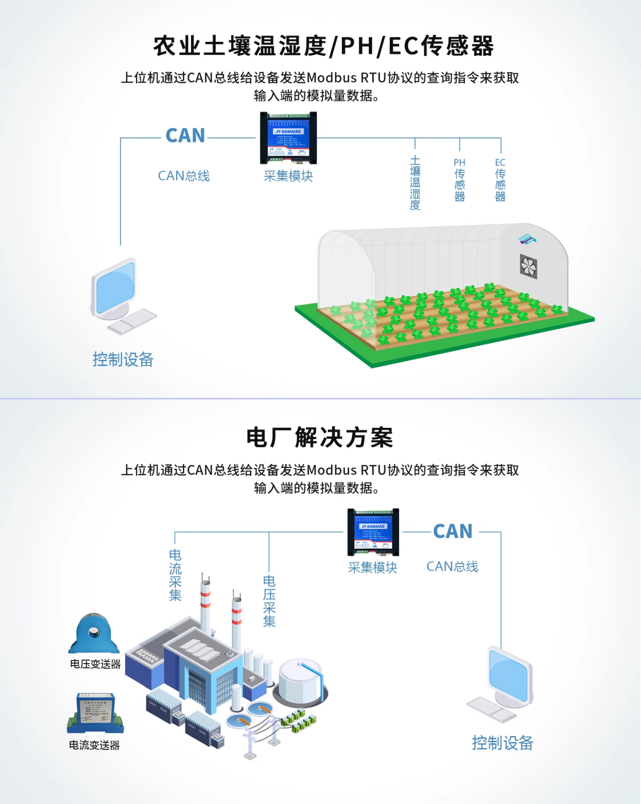 光伏电站中,采集逆变器的输出电流、汇流箱的温度,通过 CAN 总线传输至后台,优化发电效率;
