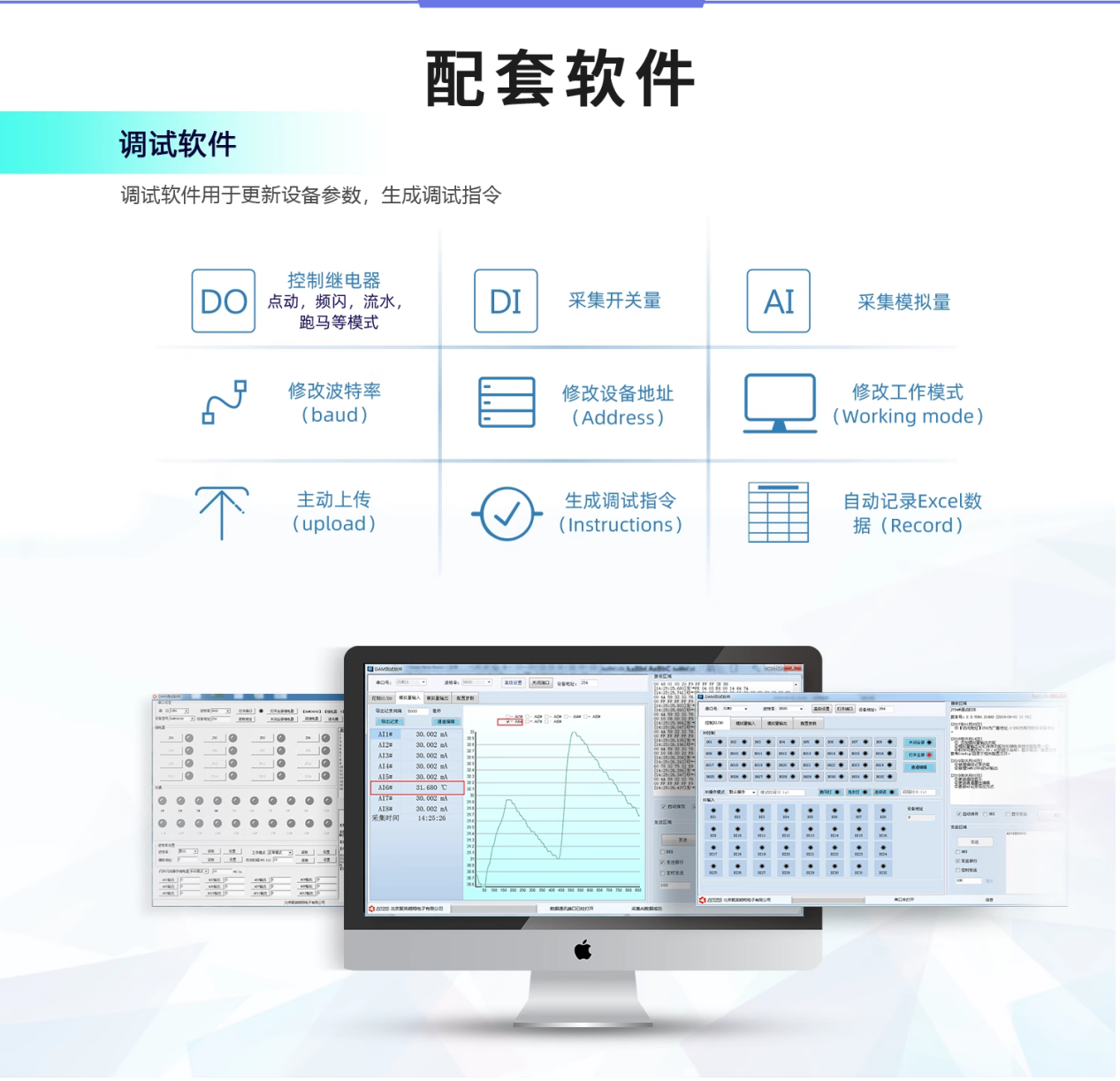 模块自带免费配套软件,包括调试软件、组态软件,可更新设备参数,控制继电器、采集开关量、采集模拟量、修改波特率、修改设备地址、修改工作模式、主动上传数据、生产调试指令、自动记录Excel数据等,支持添加多个设备,自定义修改设备图标和名称,设置模拟量量程转换,区域设备一键控制,设置多种定时规则,自动记录数据导出曲线和EXCEl数据表格。