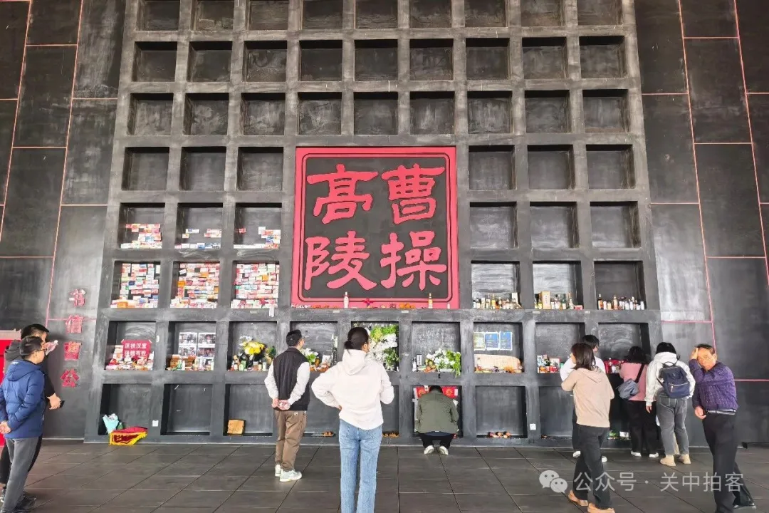 在中央的展馆内,便是高陵的地宫,前方的墙壁上写着“曹操高陵”四个大字,成为游客们争相敬献花束、摆放贡品、书写寄语、表达情怀的地方。