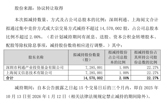 2025年9月12日,中文在线在深交所发布关于大股东股份减持计划预披露的公告。公告显示,腾讯系关联股东深圳市利通产业投资基金有限公司(以下简称“深圳利通”)、上海阅文信息技术有限公司(以下简称“上海阅文”)计划自本公告披露之日起15个交易日后的三个月内以集中竞价方式或大宗交易方式合计减持公司约1457.00万股,拟减持股份占公司总股本比例的2%。