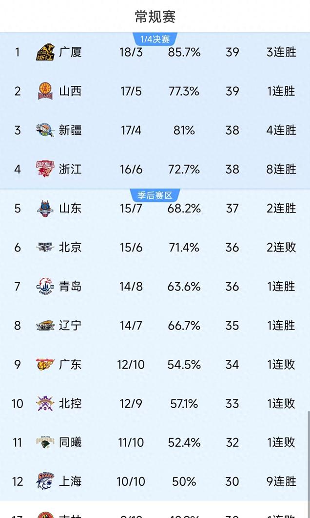 排名11-13的球队依次是南京、上海与吉林,目前南京队积分32分、上海队少赛两轮积分30分、吉林队积分30分,今晚南京与吉林就将进行本轮比赛,所有两队赛后都会累计积分。不过考虑到上海队已经获得9连胜,加上后续会补赛两轮,其实崛起势头强劲的上海队,早已锁定了前十二名额。