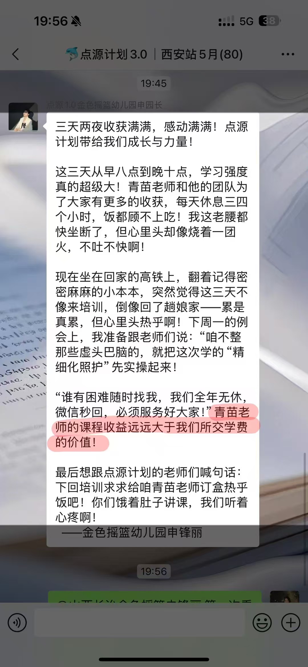 青苗老师的点源计划6.0满园系统课,还包含线上短视频运营、朋友圈打造、异业联盟等全体系策略,帮助园长零门槛掌握“线上+线下”获客方法,将接待成交率拉到90%以上。