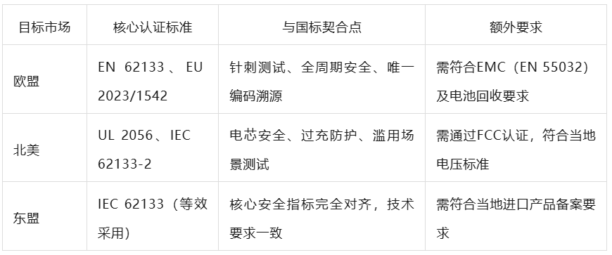 2.与区域标准的适配性:北美UL 2056、欧盟EN 62133等区域标准,均聚焦移动电源电芯安全、电路保护等核心指标。GB 47372-2026的全周期安全管理、唯一编码要求,可直接对接欧盟电池法规(EU 2023/1542)的溯源与安全管控要求,降低企业出海合规成本。