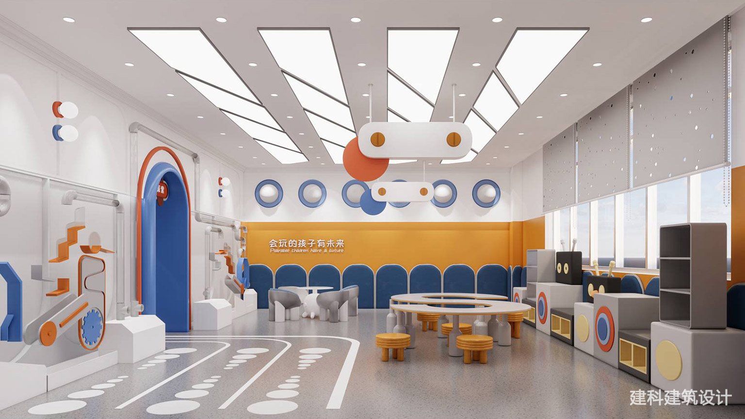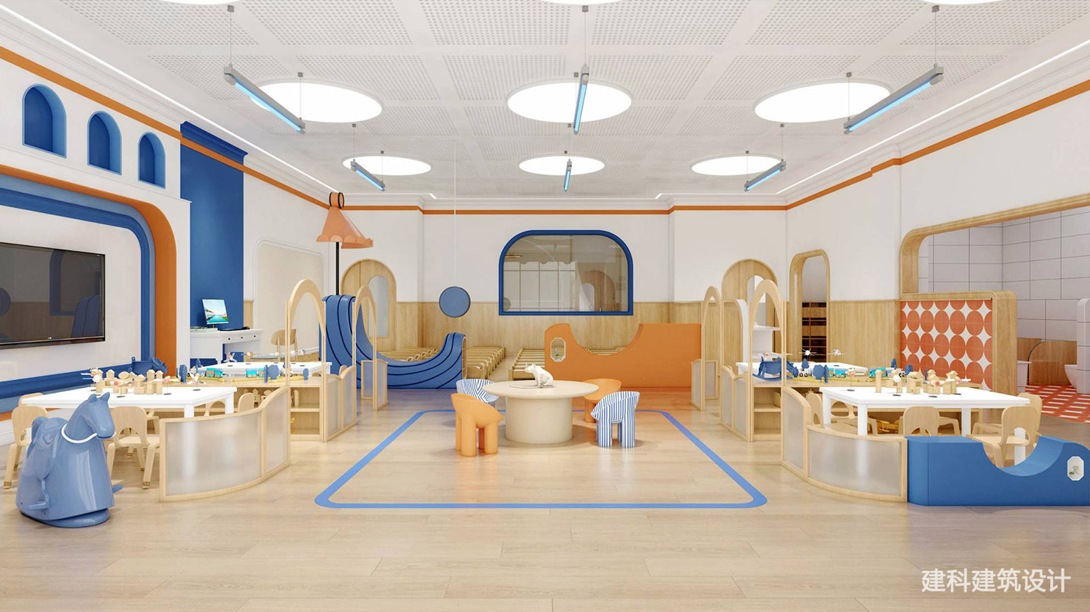 蓝橙撞色搭原木暖调,柔和不刺眼的配色自带“快乐滤镜”,既戳中小朋友的审美,又能让空间始终亮堂温馨。分区设计也超贴心:大空间够娃们撒欢互动,小角落又藏着私密感,不管是集体游戏还是安静拼搭,都能自在待着;全圆润的家具边角+软萌摆件(比如那只蓝小马),把 “安全” 藏进了每一处可爱里。在这里的每一天,都是娃蹦蹦跳跳盼着来的快乐时光。