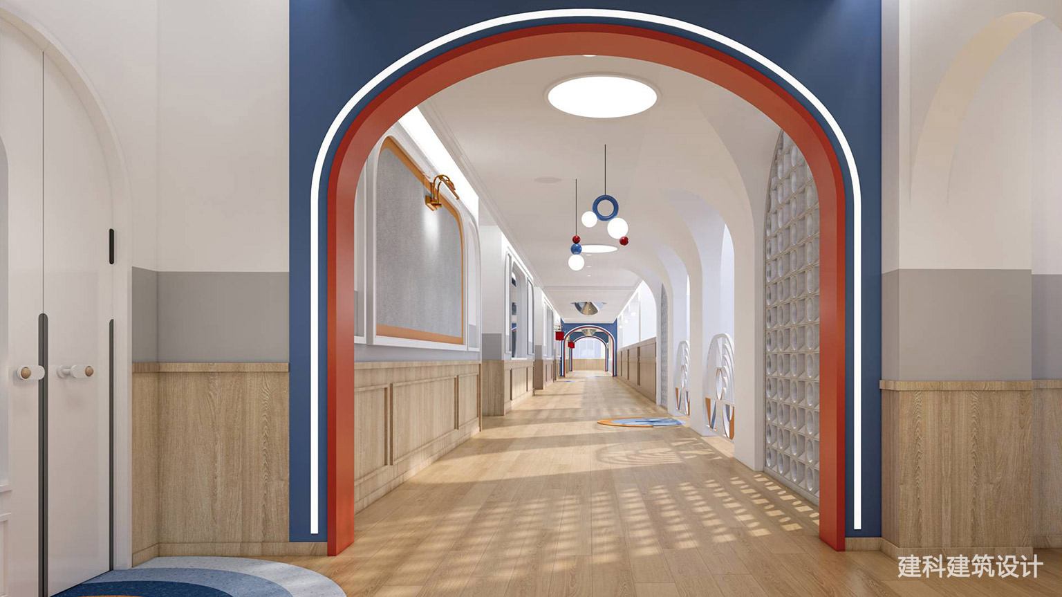 暖橙撞奶白的墙面像刚拆封的橘子糖,软乎乎的圆弧拱门裹着甜意,连空气都变活泼啦!艺术角的画架、互动区的趣味桌椅,让娃既能撒欢玩,也能沉浸式创作。大窗透进的阳光裹着木地板的暖,波点地毯踩上去像蹦进了绘本里。这里不止是教室,是装得下所有好奇与童真的小世界。