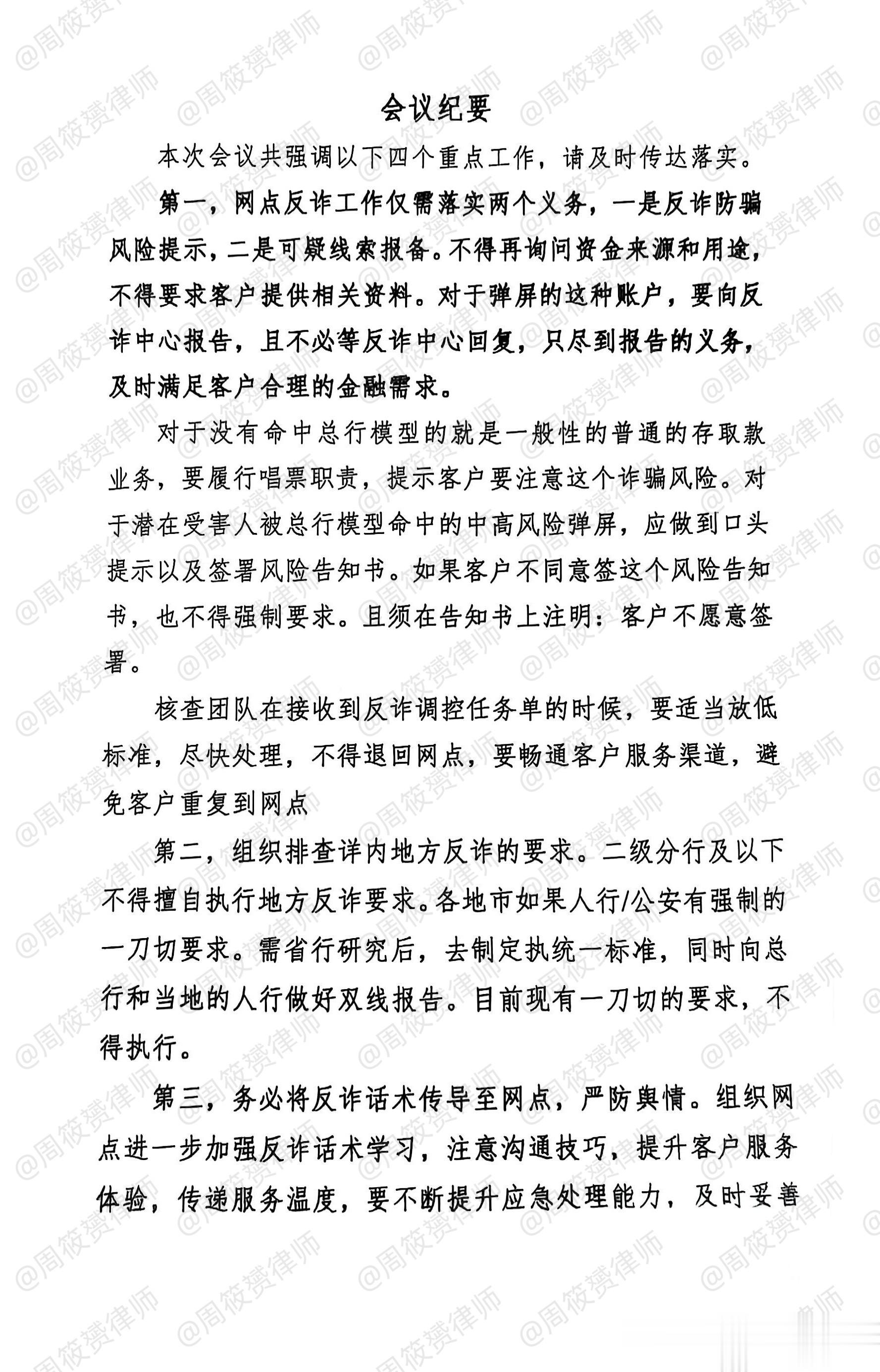 昨天,一位好心的银行柜员小姐姐,提供了一份某种让眼睛舒服的颜色标志银行(四大行之一,不是建设银行)北方某省行的《会议纪要》(共两页)给我,其中最关键的内容是:该银行不再执行地方现有一刀切的反诈要求!