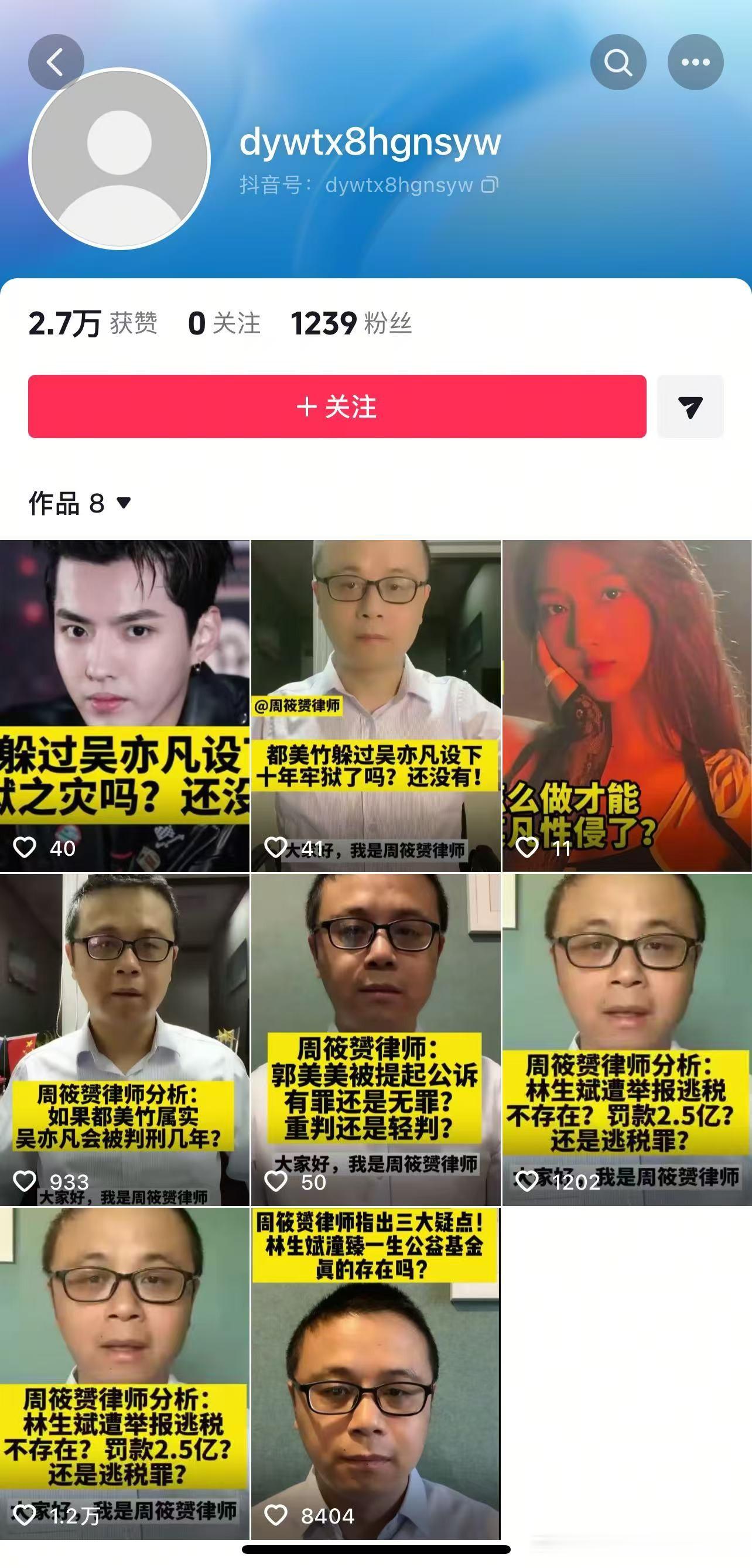 另,有很多网友一直留言问我的抖音号,说找不到。其实我有抖音号,账号是:dywtx8hgnsyw。本来账号就叫“周筱赟律师”,但因为有四年没有使用,昵称被取消了。
