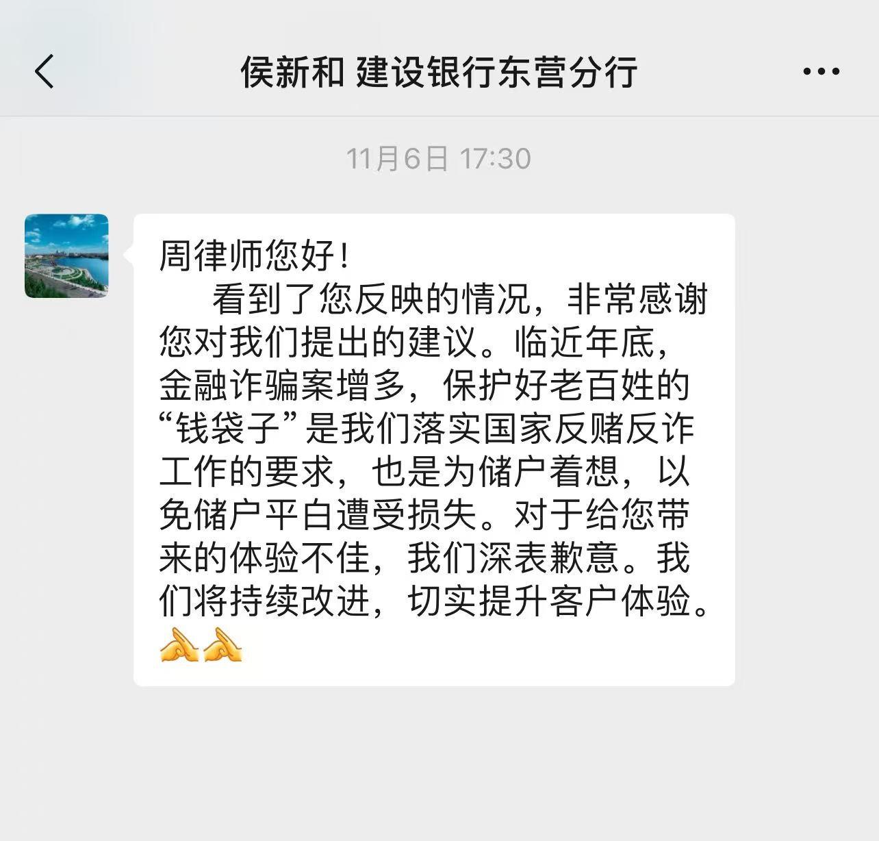 11月5日,我发布我在建设银行东营分行的经历后,该行副行长侯新和联系我,并在11月6日发送信息向我道歉。我已经公开表态不接受道歉。