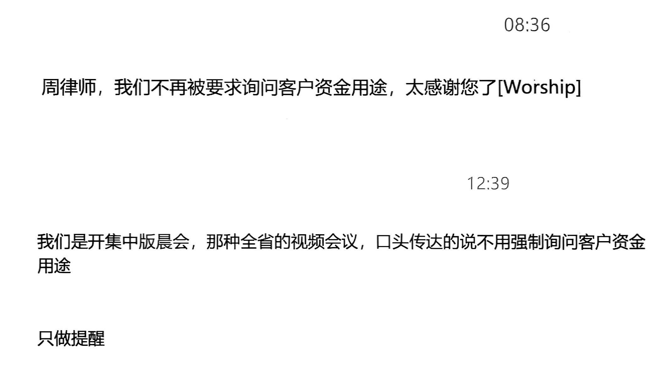 有中部某省银行的柜员告诉我,该行已经开会通知,取消询问客户资金用途,但只是口头通知,未下发文件。