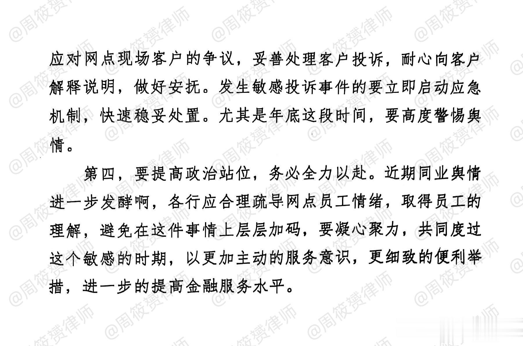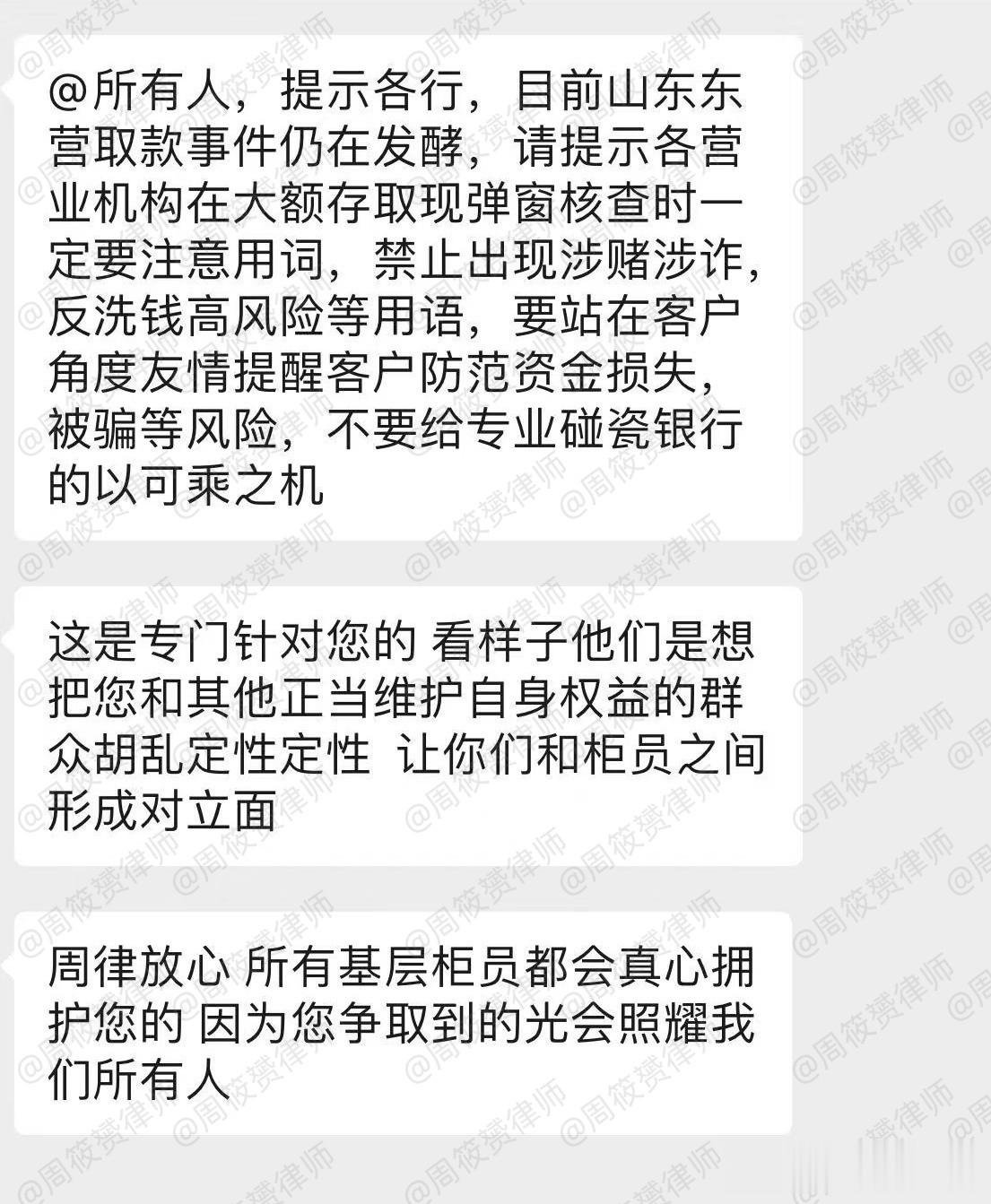 事件发酵后,全国很多银行柜员们给我留言或私信,表示支持。我真的非常感谢!有很多银行柜员,私下向我提供了银行内部文件和通知(均非涉密),我在11月13日的《周筱赟律师致全国各银行柜员们:我不会辜负你们的!》(https://mp.weixin.qq.com/s/zDUN2VYSzWqaROhDRPq69g)说了:“请你们放心,我绝对不会暴露你们的,更不会辜负你们的。至今也没有任何人暴露。”
