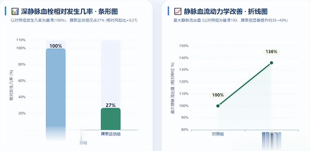 发表在《骨科手术与研究杂志》的《术后踝泵运动预防下肢骨科手术后深静脉血栓及改善静脉血流动力学:随机对照试验荟萃分析》汇总了16项随机对照试验、1704名患者,结果显示,踝泵运动组的深静脉血栓发生几率只有对照组的大约27%,而且最大静脉流出量等血流动力学指标也明显改善。