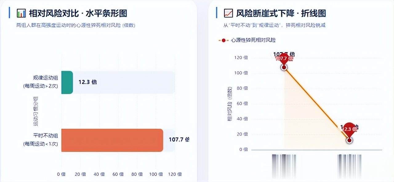 另外《国际心脏病学杂志》上的《瑞典男性重度劳累、规律运动训练与心源性猝死风险》研究,追踪了瑞典男性长达20年的数据,结果发现:平时不动的人(每周运动少于1次):在突然进行高强度运动时,发生心源性猝死的相对风险居然高达107.7倍。平时规律运动的人(每周超过2次):即使偶尔进行非常剧烈的运动,猝死风险也会大幅下降到12.3倍。