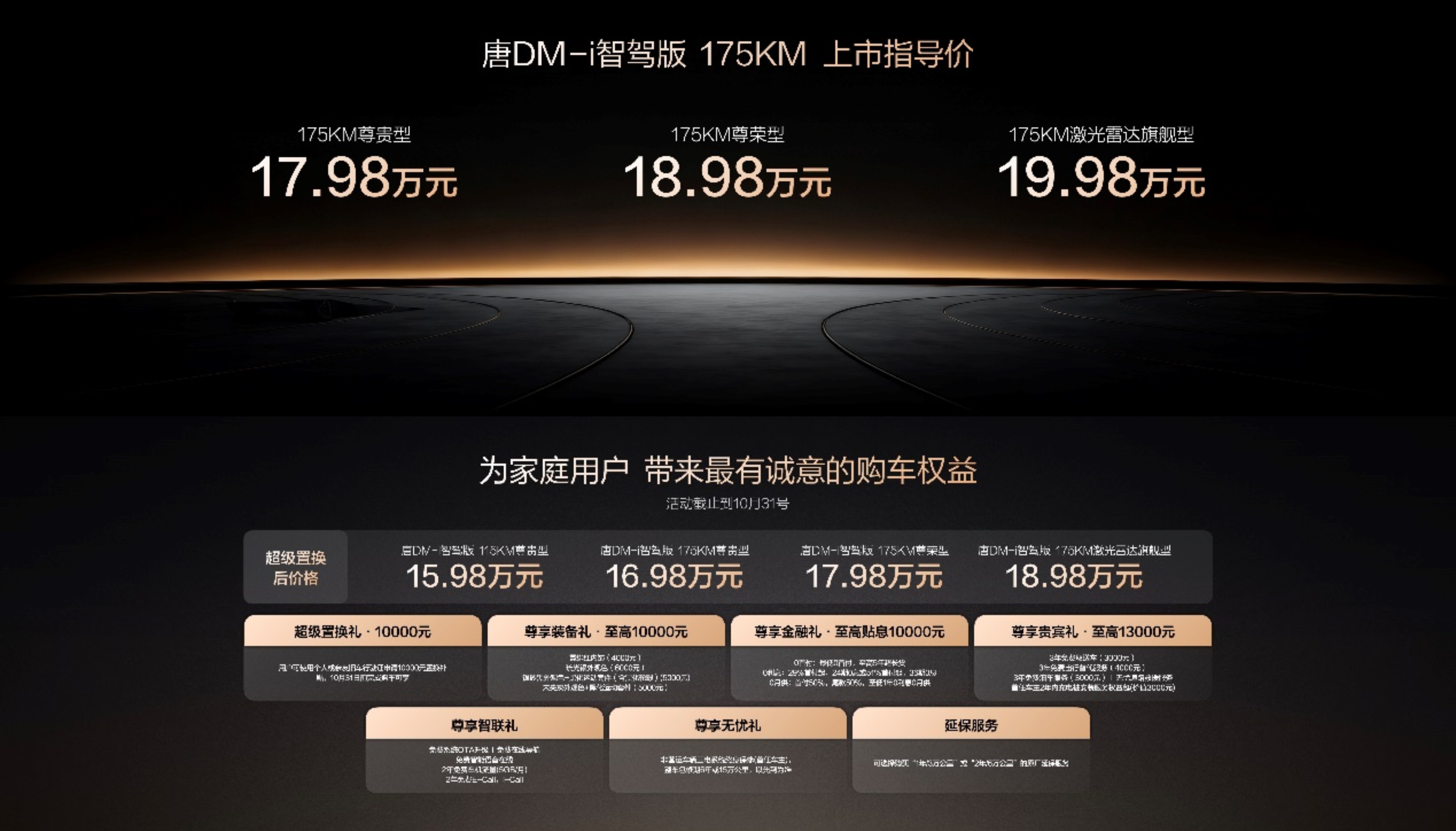 比亚迪唐DM-i智驾版 175KM长续航版于9月16日上市,可以说是有史以来最全面的唐DM-i,实力场景大升级家用车首选,175KM长续航版推出3款车型,售价17.98万~19.98万元,10月31日前购车可享10000元置换补贴,相当于16.98~18.98万元,还有至高价值4.3万元的购车权益