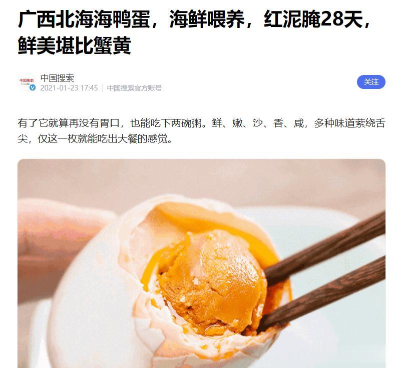 信息来源:广西北海海鸭蛋,海鲜喂养,红泥腌28天,鲜美堪比蟹黄