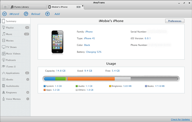 同步iOS该应用程序与各种iPhone,iPad和iPod型号广泛兼容,您可以轻松使用它进行iBooks传输。此外,它还会在主界面上显示设备信息,并允许您预览关键信息。