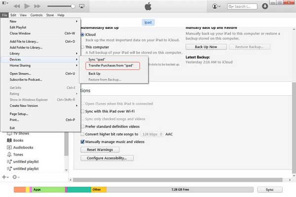 2:在 iTunes 中,找到“转移购买”选项。点击该选项,iTunes 就会开始将 iPad 上所有购买的内容复制到 iTunes 资料库。这包括你购买的电子书和其他内容。
