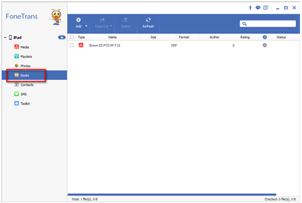 02一旦程序检测到您的设备,您将看到包含 iPad 信息的主界面。要将书籍从 iPad 传输到电脑,您可以点击左侧面板中的“书籍”选项,软件将扫描您的 iPad 以查找所有书籍。