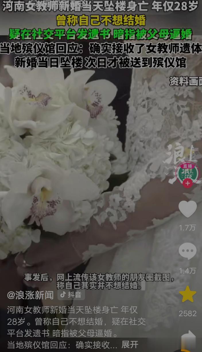 河南平顶山市鲁山县,28岁新娘雅蕊,疑因不想结婚,在结婚当天,她从7楼跳楼身亡。
