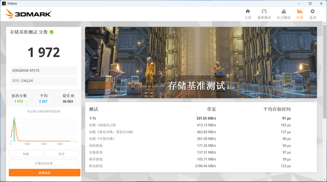 3DMark存储基准测试注重把SSD设为游戏盘的场景中对其进行游戏性能评估测试,它使用真实游戏中记录的轨迹,测试加载游戏、保存进度、安装游戏文件和录制游戏影音流等活动的性能,对游戏玩家有很高的参考价值。这项测试中,金百达KP270 1TB得分1972分,细分的测试项目可以参考下图。