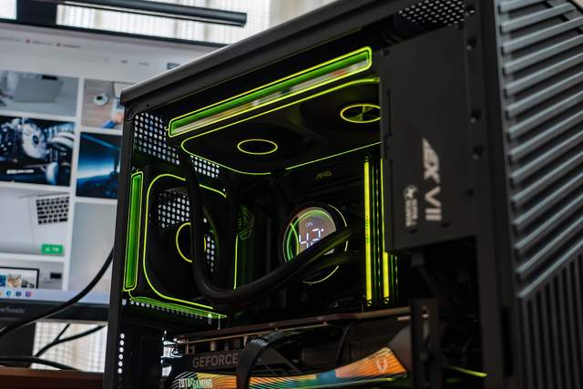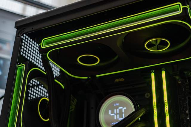 灯光方面,这套水冷支持华硕、技嘉、微星等主流主板的ARGB神光同步技术,风扇四面都有千层镜效果,怎么装都不会影响它炫酷的视觉效果。风扇四周是线条状灯带,既保留了电竞装备应有的干净利索和科技感,又避免了传统RGB风扇过于张扬的视觉冲击,恰到好处的把控了美学平衡。