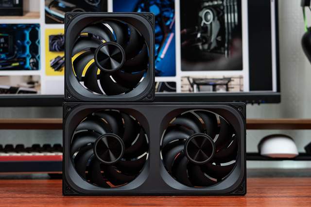 这时,可能会有小伙伴问了,机箱底部装了风扇之后还能装得下50系显卡吗?毕竟50系显卡都很厚。答案是当然可以,正常12cm风扇都厚度在28mm左右,只占用1槽宽度,一张5090D显卡的厚度在60mm-70mm之间,4个槽位的宽度足矣。