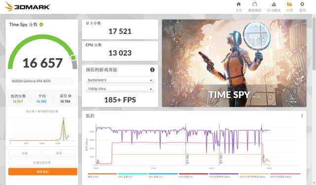 3DMark Time Spy是针对2K分辨率下 DirectX 12 游戏的基准测试,最终得分16657,其中显卡得分17521,CPU得分13023。