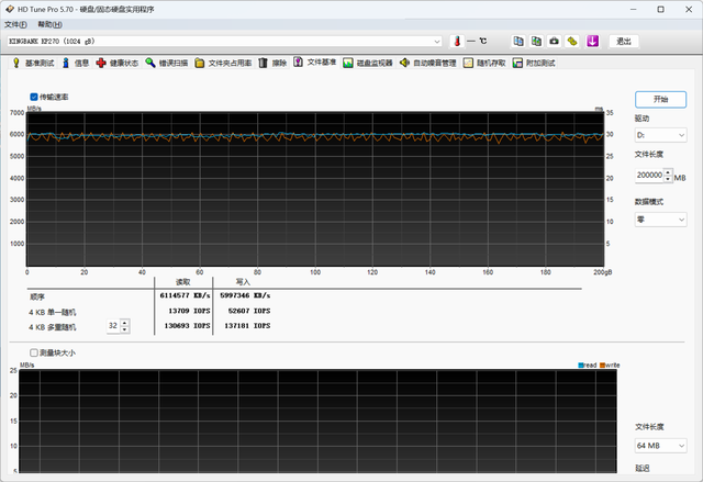 HD Tune是一款可以检测传输速率、硬盘健康状态、实时温度、磁盘表面扫描等项目的综合性硬盘测试软件,也可以测试固态硬盘的缓外速度。金百达KP270的传输速度表现稳健,在200G大文件读写测试中只有轻微波动,没有出现明显掉速现象。