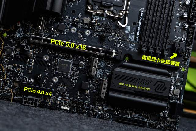 硬件方面,微星MAG B860M迫击炮主板采用12+1+1+1高规格供电模组,2oz厚度铜的6层服务器级PCB以及高精度电容&精调电感,用料非常扎实;搭载3个PCIe M.2 SSD插槽,最上方的接口是CPU直连的PCIe 5.0x4通道,最大带宽128Gbps,支持2280/2260/2242不同规格的M.2 SSD;下方的2个M.2插槽是由芯片组提供的PCIe 4.0x4通道,支持2280/2260不同规格的M.2 SSD;配备4条DDR5双通道内存插槽,单槽最高支持64GB容量,内存频率支持9200+MHz(OC)。
