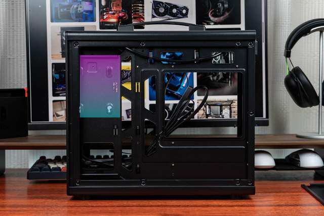 机箱背部的走线空间还算宽裕,但装上一块2.5英寸硬盘后就会有些捉襟见肘,尤其电源线如果用的是那种质地很硬的黑皮包材,安装侧板时会比较吃力。