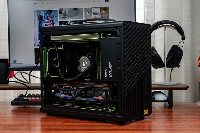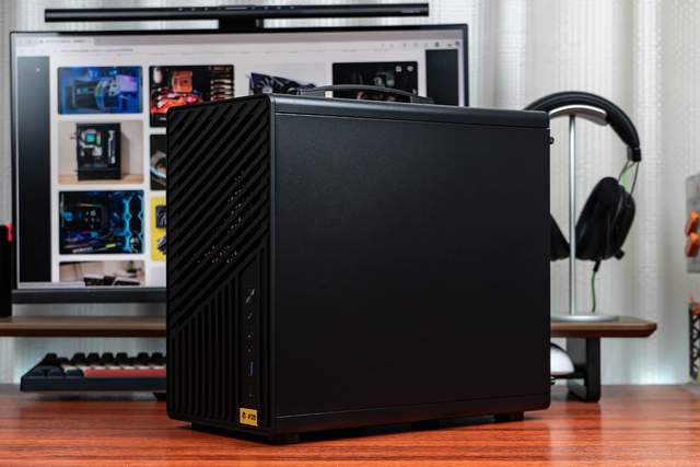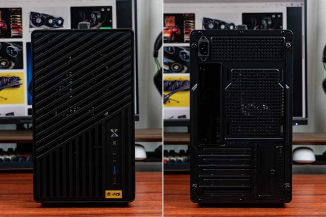 机箱正面是宽格栅+细网面组合,不仅散热好,立体感与设计感也很足。正面右下方集成了丰富的I/O接口和按键,从上到下依次为:开关键、重启键、3.5mm音频插口、USB-A 5Gbps接口、USB-C 10Gbps接口。