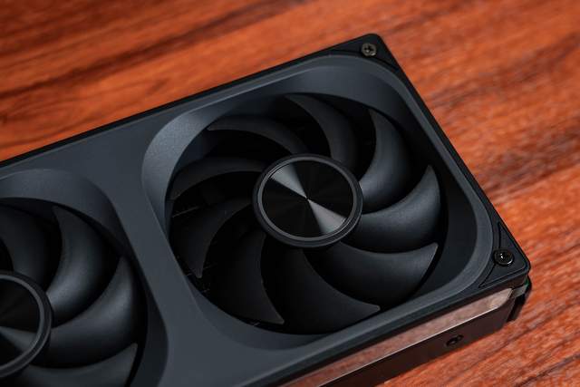 风扇中间有一个铝质CD纹铭牌,质感拉满;风扇有9片扇叶,转速700-2400 RPM、风量21.46-62.40 CFM、噪音21.3-37.3 dB,有转速高、风量大、噪音低的特点,散热效果非常不错。