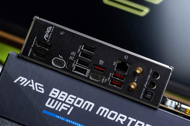 微星MAG B860M迫击炮的背部I/O非常全面,从上往下依次为:HDMI 2.1和DP 1.4视频接口、雷电4接口(有一个小闪电的符号)、清除 CMOS 按钮和更新 BIOS 按钮、4个USB-A 2.0接口、1个USB-C 10Gbps接口、3个USB-A 10Gbps接口、5G有线网口、Wi-Fi 7天线接口、1个数字光纤音频接口、3.5mm音频接口等。