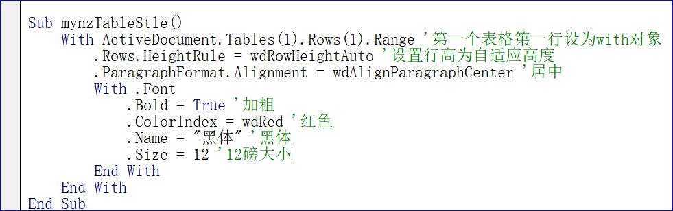 With ActiveDocument.Tables(1).Rows(1).Range '第一个表格第一行设为with对象
