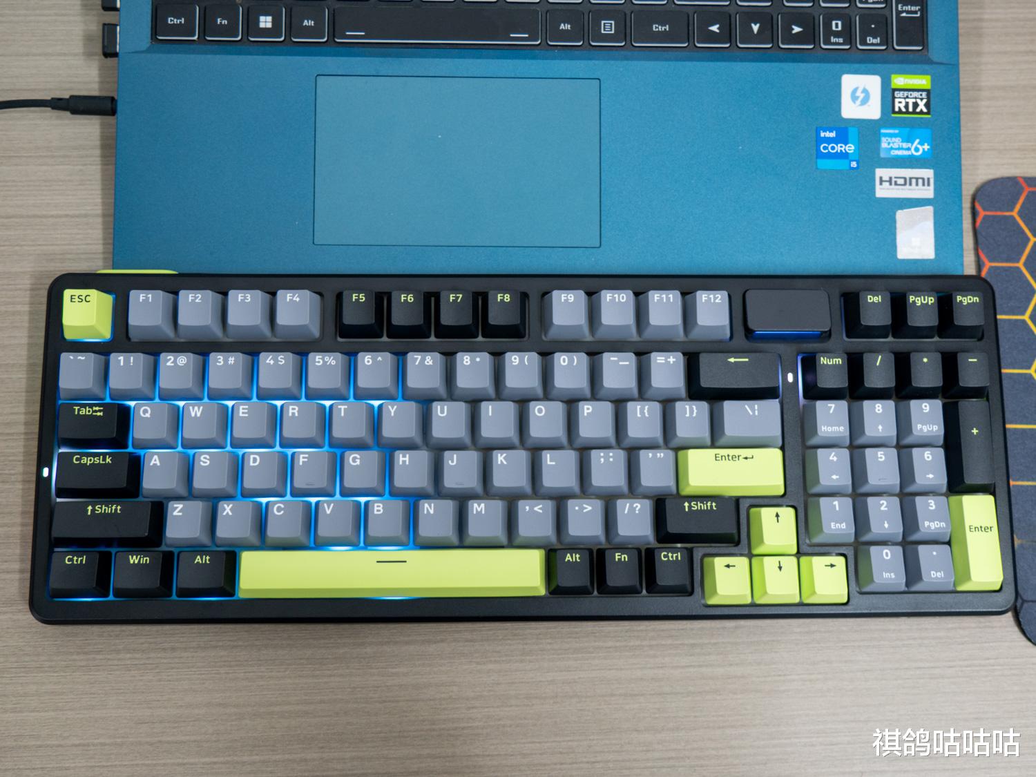 正面上看,输入内容都是以灰色键帽白色字体为主,而一些功能键是黑色键帽绿色字体为主,点缀的绿色部分是常用的功能键,比如ESC、空格、Enter、上下左右方向键,字体则是黑色,上部的F区是灰黑间隔布局。