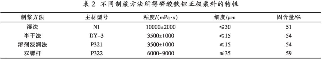 以磷酸铁锂作为正极主材,搭配导电剂SP、粘结剂PVDF进行浆料制备,部分功率型产品会考虑添加导电性更佳的导电胶液CNTs。表2为不同制浆方法所得磷酸铁锂正极浆料的特性。